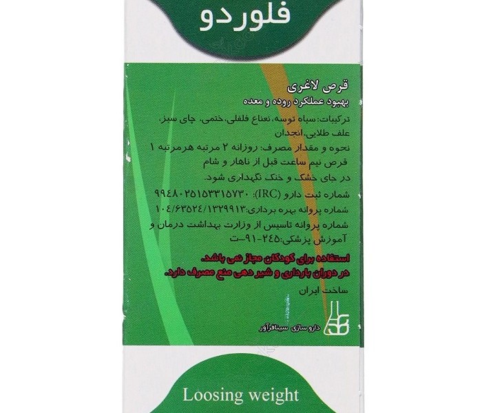 قرص فلوردو یک فرآورده طبیعی و صد در صد گیاهی برای کمک به کاهش وزن و لاغری میباشد. قرص فلوردو دارای ترکیبات بر گرفته از طب سنتی و گیاهی بوده که به کاهش وزن، رفع یبوست، افزایش متابولیسم و بهبود عملکرد معده و روده کمک میکند. قرص لاغری فلوردو در بسته بندی 60 عددی توسط شرکت داروسازی سینافراور تولید و بستهبندی شده و در داروخانههای معتبر به فروش میرسد.