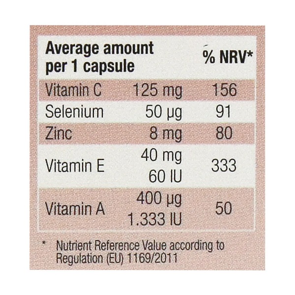 ویتامین C، ژلاتین گاوی، ویتامین E، روغن دانه سویا، گلیسیرین جاذب رطوبت، روغن دانه سویا سفت شده، اکسید روی، امولسیفایر لسیتین سویا، آب خالص شده، ویتامین A، E171، E172، سدیم سلنیوم